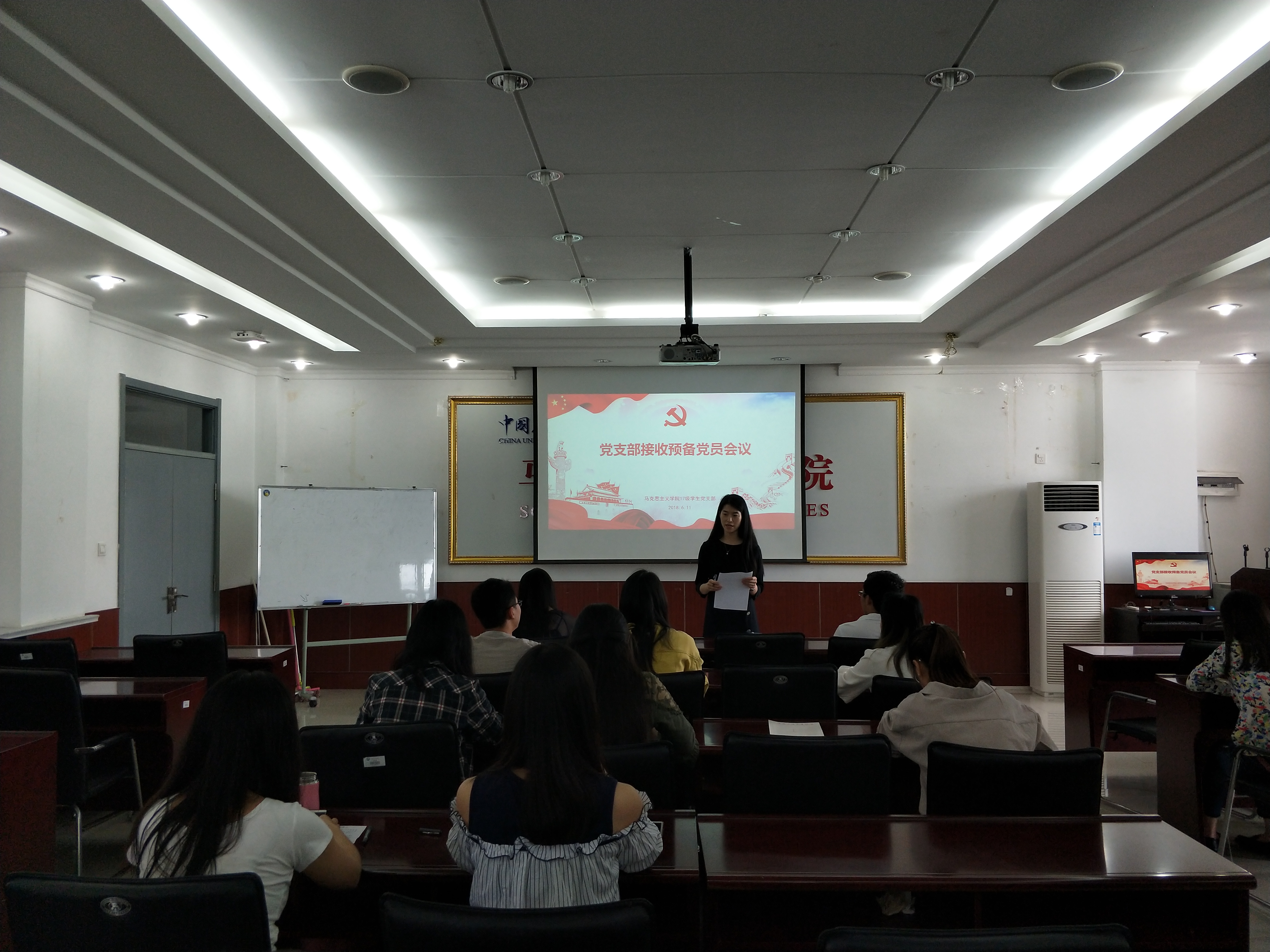 2018年6月11日星期一上午9:30,威尼斯金沙欢乐娱人城研17级党支部于文理楼457召开接收预备党员的支部大会,出席本次会议的有党支部委员会全体成员、学生党员以及新一批发展对象。本次大会的主要内容为讨论、票决是否接收李佳妮、吴琼、刘天骄、孙子璇、常文文五名同志为中共预备党员,会议由党支部书记董啸楠担任主持。本次支部大会应到18人,实到16人,其中正式党员应到13人,实到11人。