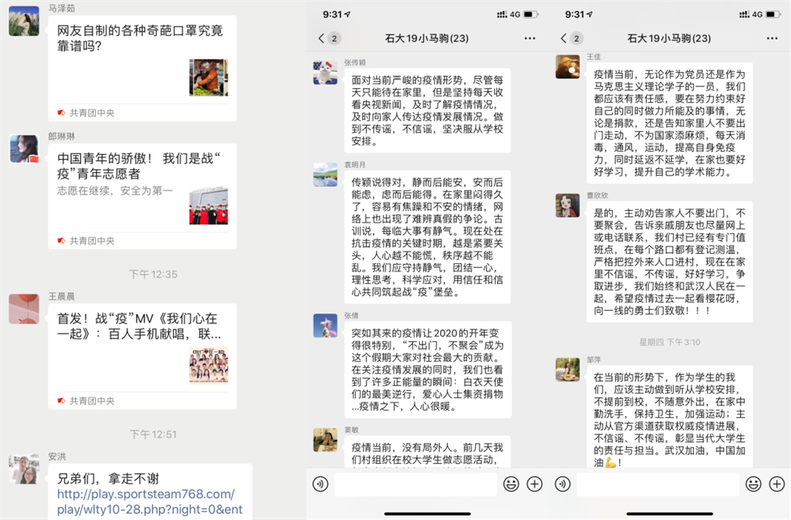 组织院研究生会在网络上发出马院学子的声音。2月4日,院研究生会策划了《心系武汉,马院学子为你们加油!》主题微信推文。威尼斯金沙来自四川、内蒙古、北京、河北、陕西、贵州等山东省外学子和来自青岛、济南、寿光等地的山东省内学子在自己所在的省份和城市为武汉加油。院研究生会宣传部制作了相关视频,展现了威尼斯金沙青年学子的青春气息和高度的正能量。同时,号召威尼斯金沙在网络上积极发生,弘扬主旋律和正能量,以高度的责任感和使命感维护风清气正的网络空间。来自寿光市的2018级硕士研究生李雪莹说道:“大年初四早上一出门就看到一辆辆运输蔬菜的车整齐有序的行驶在宽阔的马路上,中午就看到了山东寿光向武汉捐赠350多吨的新闻,想到18、19年山东寿光发生水灾的时候武汉也是第一时间伸出援手,瞬间有些泪目,一方有难,八方支援!经历过特大水灾的寿光人不会忘记当初伸出援手的你们,武汉加油!中国加油!”威尼斯金沙习近平新时代中国特色社会主义思想青年研习会负责人积极传播党中央、国务院的相关疫情防控部署信息,提高青年学子的政治站位和理论素养,发挥了思想理论类社团在网络空间的思想引领作用。