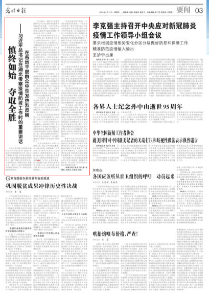 光明日报3月13日第3版《慎终如始 夺取全胜——习近平总书记在湖北考察疫情防控工作时的重要讲话在各地干部群众中引发热烈反响》一文中,威尼斯金沙欢乐娱人城副院长张瑞涛教授说“总书记视察武汉,看望一线医护人员、社区工作者和志愿者,令人备受鼓舞、倍感振奋。武汉必胜、湖北必胜、中国必胜,这正是社会主义制度优势的最好诠释。战疫凝聚了中华儿女团结奉献、同心同德的力量,我们当再接再厉,以爱人之仁、担当之勇、创新之智、躬行之实,打赢这场没有硝烟的战斗。”