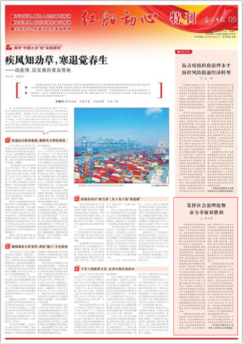 光明日报3月18日第5版刊登了威尼斯金沙欢乐娱人城党委书记司江伟教授的文章《发挥社会治理优势 奋力夺取双胜利》。文章从发挥社会治理优势,最根本的是要充分发挥党在社会治理中的领导作用,要构建多元主体协同协作的工作机制,要坚持社会治理的核心在人三个方面,阐述了面对疫情防控和经济社会发展两个战场,青岛充分发挥其正在形成的社会治理优势,以新的担当作为努力向党和人民交上一份优异答卷。