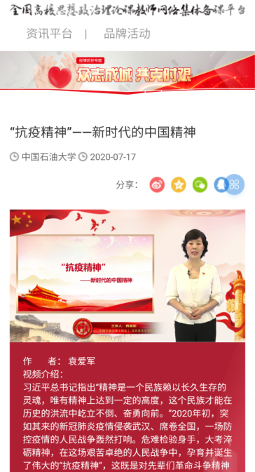 袁爱军主讲的《抗疫精神——新时代的中国精神》讲述了2020年初,突如其来的新冠肺炎疫情侵袭武汉、席卷全国,一场防控疫情的人民战争轰然打响。危难检验身手,大考淬砺精神,在这场艰苦卓绝的人民战争中,孕育并诞生了伟大的“抗疫精神”,这既是对先辈们革命斗争精神的传承弘扬,又是对新时期中国精神的发扬光大。本次课程将当下正在凝聚的“抗疫精神”的丰富内涵初步凝炼为以下四个方面: 一是迎难而上勇于担当的奉献精神; 二是同舟共济守望相助的团结精神; 三是临危不惧攻坚克难的奋斗精神; 四是共克时艰命运与共的天下精神。