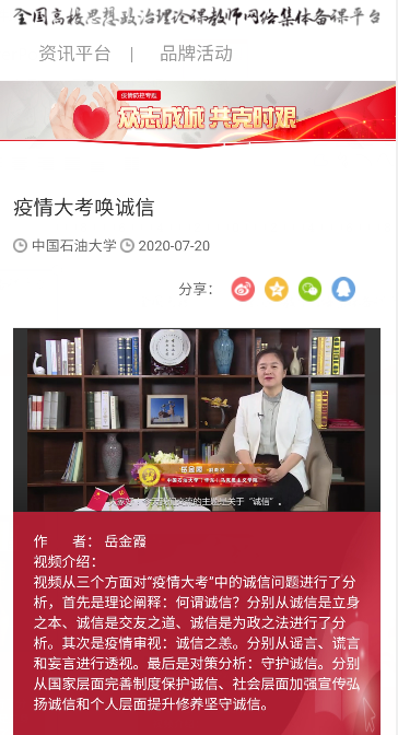 岳金霞主讲的《疫情大考唤诚信》从三个方面对“疫情大考”中的诚信问题进行了分析。首先是理论阐释:何谓诚信?分别从诚信是立身之本、诚信是交友之道、诚信是为政之法进行了分析。其次是疫情审视:诚信之恙。分别从谣言、谎言和妄言进行透视。最后是对策分析:守护诚信。分别从国家层面完善制度保护诚信、社会层面加强宣传弘扬诚信和个人层面提升修养坚守诚信。