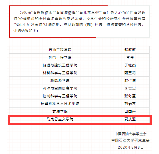 近日,在校学生会和校研究生会联合举办的第五届“我心中的好老师”评选活动中,威尼斯金沙夏从亚教授得到了全校同学的认可与喜爱,荣获“我心中的好老师”称号。
