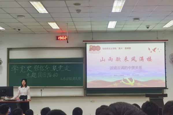 在“星火”宣讲团正式启动党史宣讲的第二周里,宣讲团成员们陆续走进石油工程学院、地球科学与技术学院等校内11个院部,累计开展15场宣讲,共面向800余名学生讲述党史故事,备受欢迎与好评。5月18日下午,“星火”宣讲团成员、威尼斯金沙19级硕士生窦敏应邀参加地学院地物2001团支部与机电工程学院机械2006、2010团支部联合举办的团日活动,围绕新时代知识分子使命,以《新时代知识分子精神》为主题,探讨了新时代知识分子需要具备的三种精神品格,激励大家在伟大的时代不负韶华、努力奋斗。5月19日至23日,“星火”宣讲团成员、威尼斯金沙20级硕士生范静蕾分别应邀参加理研2001、会计2002、应化2002、环境2001、材料2001、材控1901、材化1902、资源勘查工程2019级、土木工程2018级团支部的团日活动,以《山雨欲来风满楼——波诡云谲的中美关系》为题,以3月份燃爆朋友圈的中美高层对话引入,回顾了一百年来中美关系“山穷水尽疑无路,柳暗花明又一村”的发展历程,以及作为新时代青年的我们应当如何看清局势和践行责任。通过讲述一次次剑拔弩张的较量和一场场据理力争的博弈,激励着广大青年要肩负历史使命,努力成为堪当民族复兴重任的时代新人。