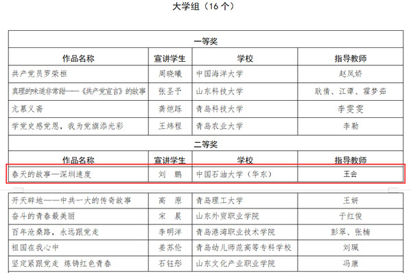 据悉,此次青岛市“学党史·知党情·跟党走”青岛市中学生(大学生)党史故事宣讲比赛由青岛市教育局主办,围绕“知史爱党、知史爱国”暨“四史”教育主题,厚植爱党爱国爱社会主义情怀,共设置小学、初中、高中、大学四个组别。经市教育局组织专家评选,大学组最终评选出一等奖4名、二等奖6名,三等奖6名。